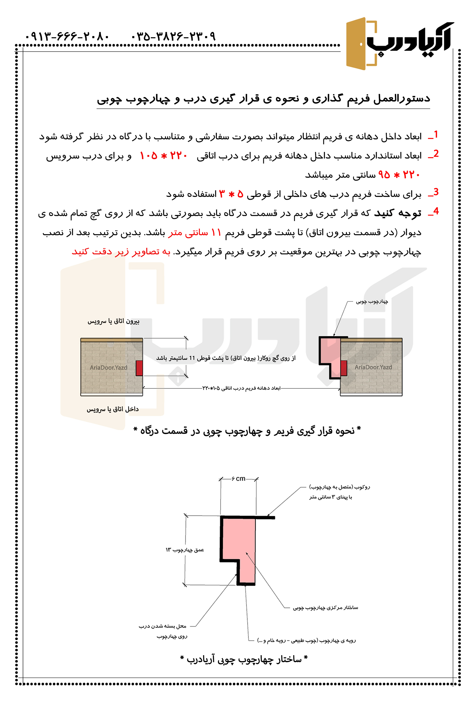 * شرکت آریادرب یزد چهارچوب های چوبی را بصورت یکپارچه تولید میکند که از دوام و زیبایی بسیار بالایی برخوردار است.نمونه هایی از درب و چهارچوب های چوبی را میتوانید از قسمت محصولات و پروژه های اجرا شده مشاده کنید.
